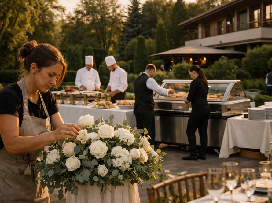 Florile proaspete reprezintă cel mai mare cost variabil — un aranjament floral de masă cu flori de sezon costă între 80 și 250 de euro, în timp ce unul din flori exotice poate depăși 400 de euro. Iluminatul festoon și structurile de chirie adaugă între 500 și 2.000 de euro în funcție de suprafața acoperită. Mobilierul lounge exterior de calitate premium poate costa suplimentar 800–1.500 de euro pentru o zonă de 50 mp.